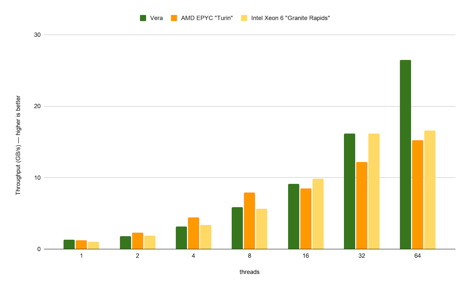 The graph above shows cross-core SQL engine shuffle throughput in a benchmark conducted on various configurations, up to 64 cores. Shuffle is a key database primitive used for operations like joins and aggregations. The shuffle implementation is uniquely designed to scale linearly with the number of cores, assuming sufficient cross-core memory bandwidth. Again, Vera shines, scaling up to and beyond 64 cores, whereas other architectures flatten out after 32 cores due to memory bandwidth saturation. In these tests, you can see how Vera performed up to 73% faster than AMD “Turin.”