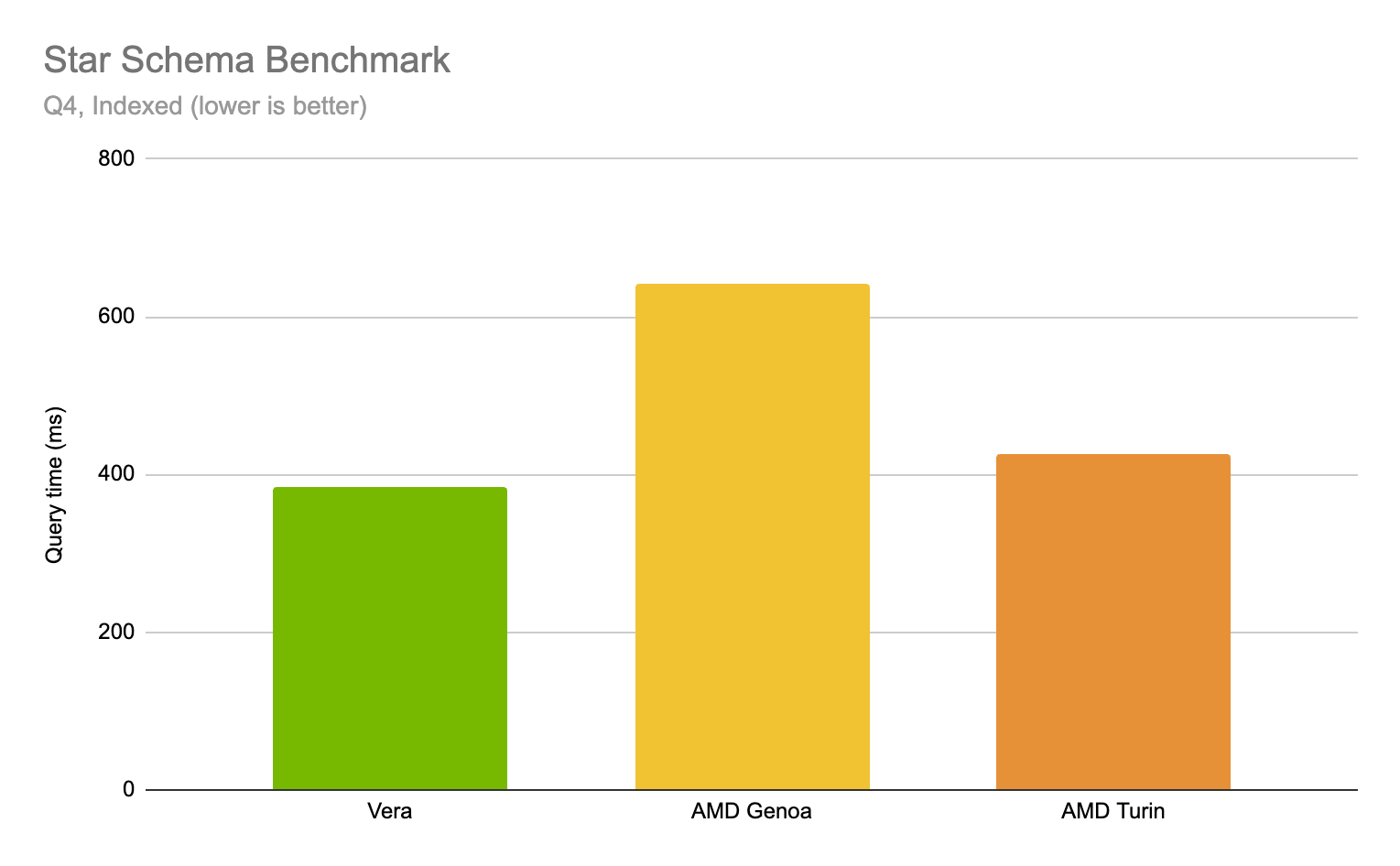 The plot above shows the result of running SSB Q4 (indexed) on Redpanda SQL, our distributed SQL engine, across our test systems: Vera finishes the 4-table join 1.1x faster than the AMD EPYC “Turin,” and 1.7x faster than the previous-generation AMD EPYC “Genoa” instance.