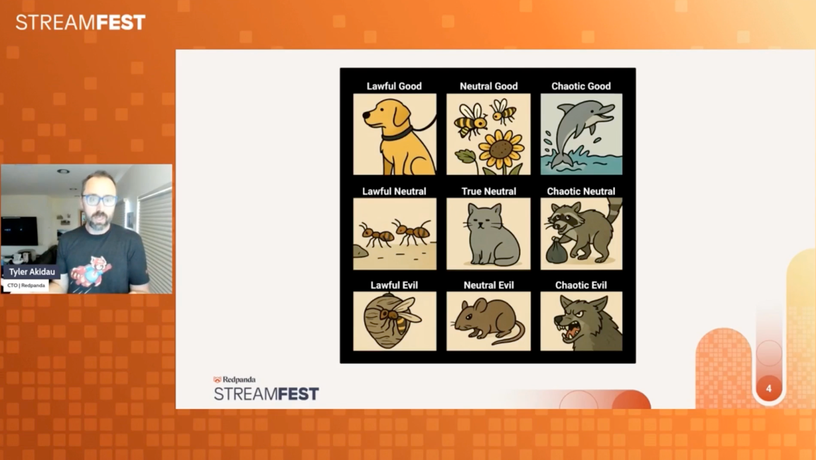 In true Tyler fashion, he framed his session with a Dungeons & Dragons alignment grid, where each grid represents a personality type. Instead of D&D characters, this one describes AI agents.