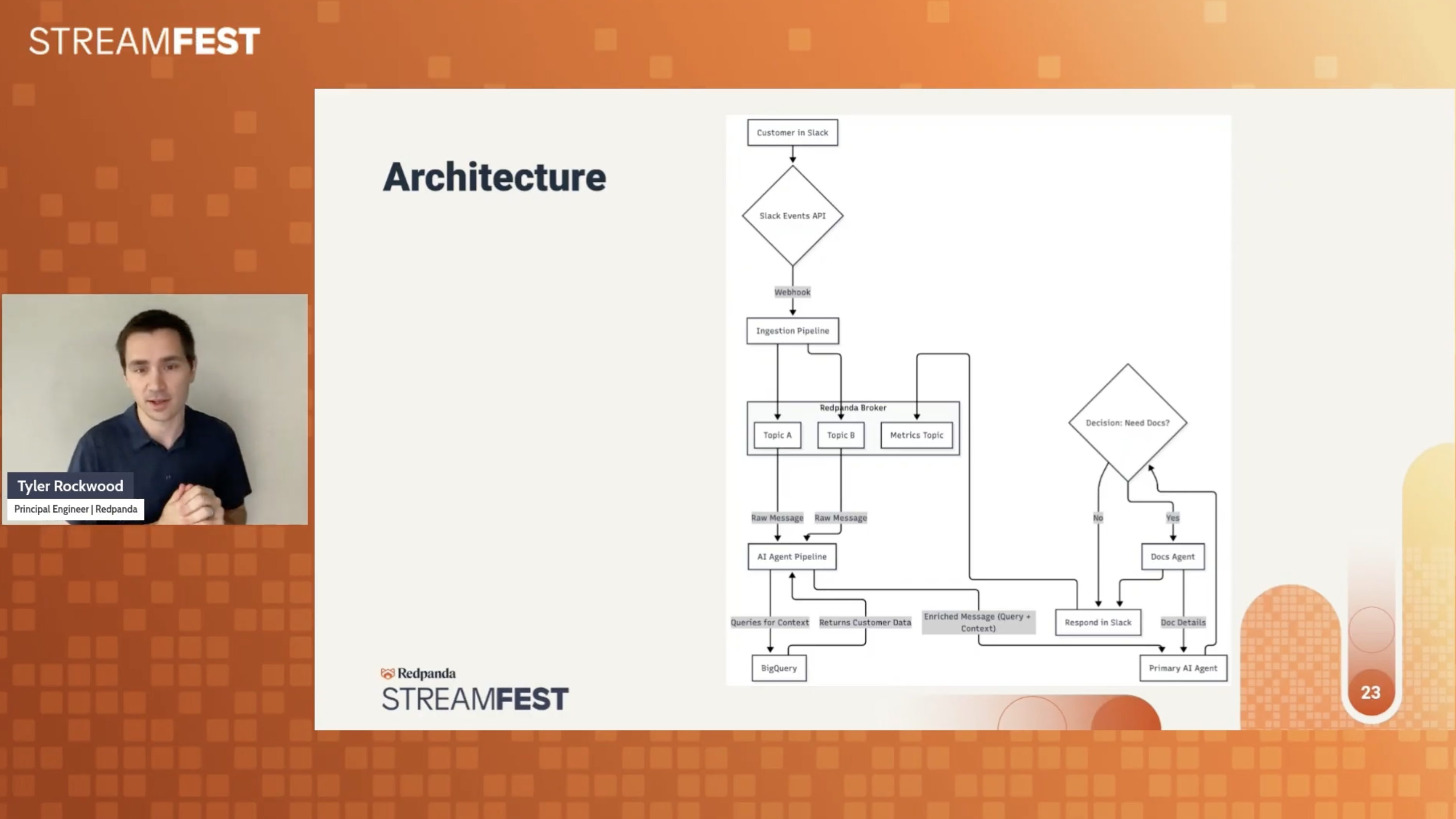 Chandler’s session zoomed in on how Redpanda helps with logging and observability, so you can reliably handle streams of events and easily scale when needed. To show it in action, he walked through setting up a lean AI agent that emits real-time data, and then using Redpanda Connect to filter that data for different uses.
