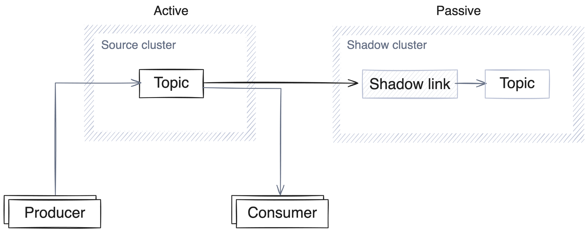 _schemas topic can be replicated when the feature is enabled, allowing schemas (and schema settings, such as compatibility) to be replicated.The architecture follows a simple active-passive pattern. The source cluster processes all production traffic while the shadow cluster remains in read-only mode, continuously receiving updates:
