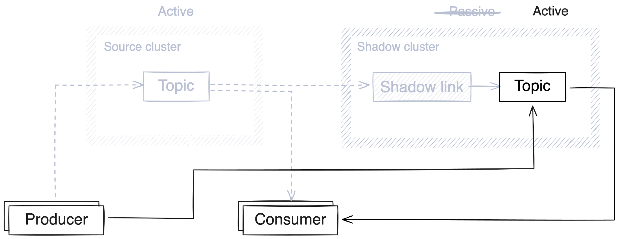 This is where failover comes in. When you failover a link, either by topic or entirely, the replication flows stop and the linked topics will become writable to regular producers. At this point, you can migrate your consumers and producers by reconfiguring them to point directly to the shadow cluster instead of the source cluster and continue where you left off.