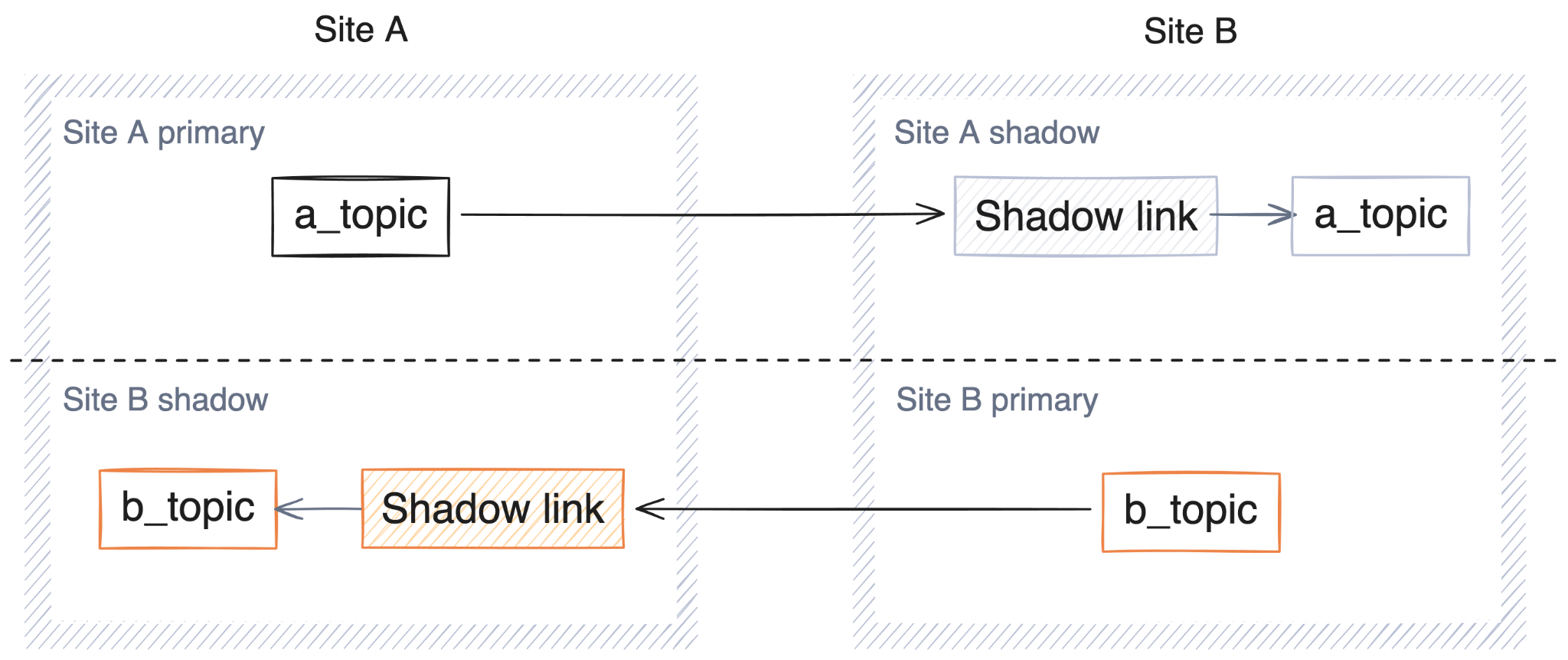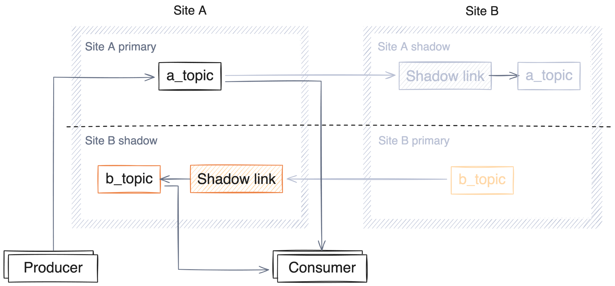 Let’s say you run your business in two regions, and have producers (and Redpanda clusters) based in each region. Under normal circumstances, you’d want each producer to write to their local Redpanda cluster in order to get the lowest produce latencies, rather than having some of them always write to a distant cluster. This kind of reciprocal active-passive architecture, in which both clusters are active and usable, can still be achieved with parallel shadow links.