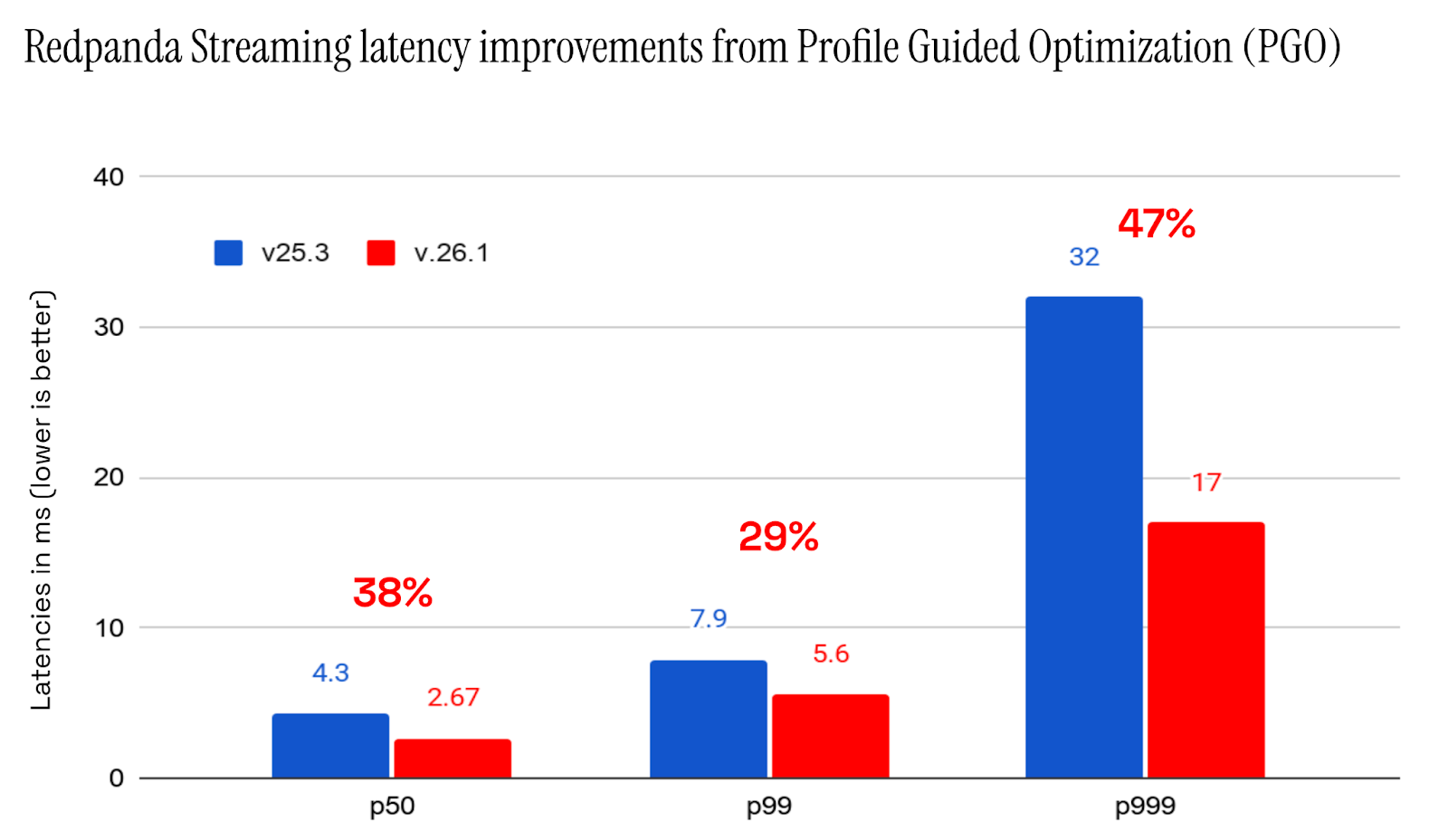 For Redpanda Streaming 26.1, we investigated optimizing the Redpanda binary with clang’s compiler-based profile-guided optimization (PGO) and also using LLVM BOLT.