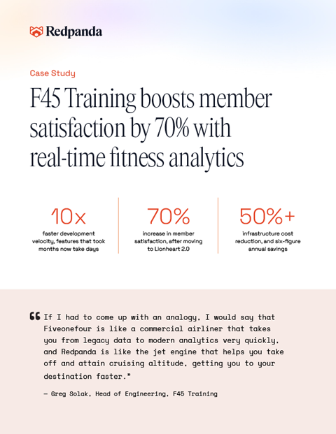 Redpanda became the jet engine powering F45’s transformation from legacy to modern analytics. With it, they were able to migrate 50 million historical records in just 30 days—well ahead of their desired timeline.